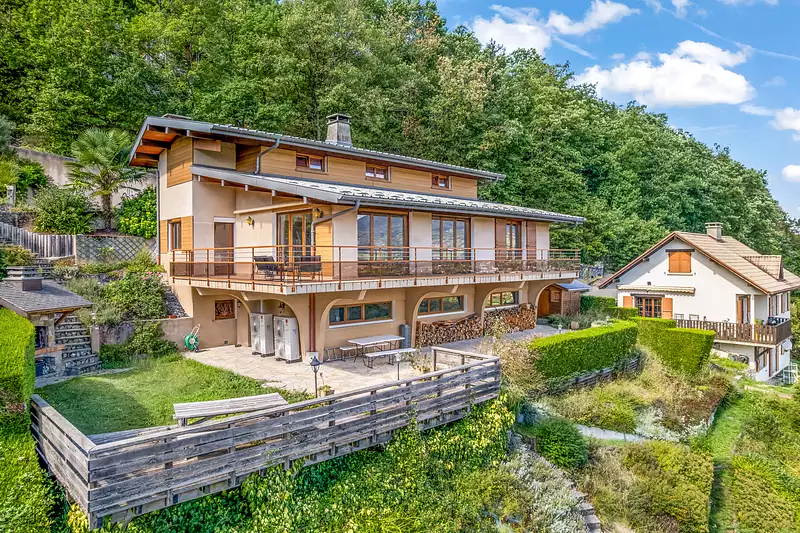 NOUVEAU - Située dans la commune de Monnetier-Mornex, à quelques minutes de la douane pour Genève, cette maison d’architecte de 255 m2 profite d’un environnement calme et verdoyant, tout en offrant une vue imprenable sur la chaîne du Mont-Blanc.