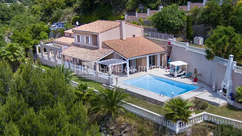 Entre Gairaut et Aspremont, magnifique villa provençale sur deux niveaux, 256 m² habitables avec piscine, terrasses et vues panoramiques sur la mer et la montagne, à 25 min de la Promenade des Anglais et de l'aéroport de Nice.