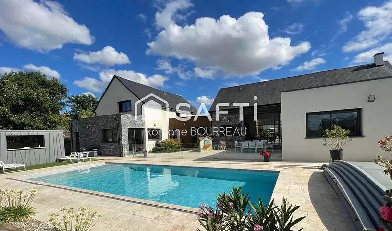 Cette maison de 260 m², construite en 2020, offre un vaste espace de vie luxueux avec ses 7 pièces, dont 5 chambres. Les matériaux haut de gamme utilisés attestent du souci du détail apporté à la construction. Le rez-de-chaussée accueille un salon/séjour, une cuisine ouverte équipée, 3 chambres dont une suite parentale avec dressing et salle de bain/douche, une buanderie et wc séparés. À l'étage, 2 chambres avec douche et wc séparés offrent intimité et confort. Pour compléter ce bien d'exception, un double garage, une piscine, un étang, la climatisation gainable airzone et un plancher chauffant au rez-de-chaussée viennent parfaire le confort et la qualité de vie offerts par cette demeure unique.