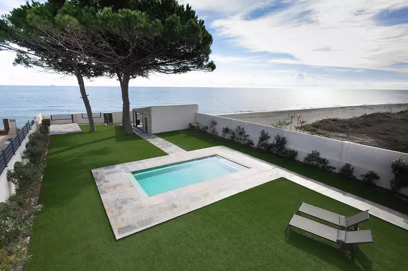 Située sur la côte prisée de La Marana,à seulement 5 minutes de l'aéroport international de Bastia Poretta, cette élégante propriété les pieds dans l'eau d'environ 257 m² offre un accès privé et direct à la plage, un garage à bateau avec sortie sur le sable, et une piscine au sel chauffée.