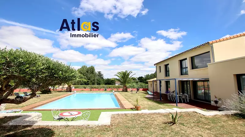 Réf. 2563B : Votre agence ATLAS IMMOBILIER vous propose cette magnifique maison contemporaine de 257 m² habitables sur son terrain paysagé de 2 245 m², alliant volumes et confort de vie, situé dans un joli village à 10 mn de NIORT. La maison est composée d'un grand espace de vie avec sa cuisine aménagée et équipée, sa salle à manger et son vaste salon avec insert au bois, d'une arrière-cuisine très fonctionnelle avec accès à un grand garage attenant de plus de 50 m², de 3 WC, de 5 chambres dont : * un espace parental avec chambre, dressing, salle de bains et bureau, à l'étage. * une chambre avec sa salle d'eau privative en rez-de-chaussée. * 2 autres chambres avec leur salle d'eau commune en rez-de-chaussée. * 1 grande chambre en rez-de-chaussée. L'extérieur dispose d'une terrasse, d'une grande piscine, d'une cuisine d'été et d'une grande dépendance comprenant un atelier et un préau très fonctionnels. Le tout sur un beau terrain de 2245 m² clos et joliment arboré. Située au calme, au coeur d'un joli village qui propose de nombreux services de proximité, à 10 mn du centre-ville de NIORT, proche de la zone commerciale Mendès France et de l'axe autoroutier. Une superbe maison fonctionnelle et chaleureuse, aux allures de vacances, proche de toutes commodités. Venez la découvrir, elle va vous séduire !!! Plus de photos disponibles sur demande. Pour visiter et vous accompagner dans votre projet, contactez Corinne STIEVENARD ou Annabelle GUILLOT, agissant sous le statut d'agent commercial auprès de l'agence ATLAS IMMOBILIER T.05.49.77.53.11, immatriculé au RSAC de NIORT sous le n° 899.878.730. Annabelle GUILLOT (EI) Agent Commercial - Numéro RSAC : 899878730 - NIORT.