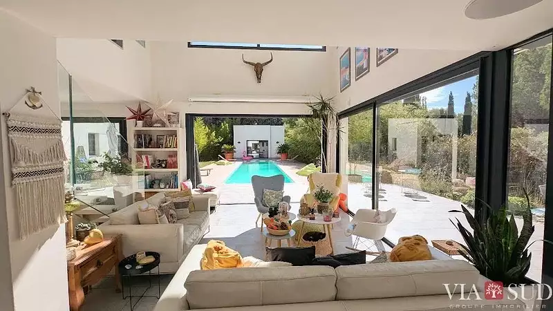 Cessenon sur Orb, c'est au bout d'une impasse que se dessine cette superbe et confortable villa d'architecte au style moderne et aux lignes pures. Maison à l'abri des regards, dominant fièrement son jardin paysagé et la campagne environnante. Une vie en pleine nature à 800m du cur du village, ou vous retrouverez son marché, ses commerces et cafés, 4 médecins, infirmiers, Kinés ou encore collège et écoles. Coté maison, vous serez séduit par de larges baies donnant sur le jardin et la piscine. Patio intérieur, 4 chambres, 2 salles de bains, cuisine équipée et home cinéma en RDC. Suite parentale de 47m² à l'étage avec vue panoramique. Pool house 30m² et double garage 80m². Une vie toute en transparence et en lumière pour cette villa d'exception. La piscine avec son espace détente et sa vue dégagée, nous font ressentir calme et sérénité. Un lieu extraordinaire ou la qualité de vie prend tout son sens. Un studio avec entrée indépendante pour vos amis ou de la location saisonnière finira de vous séduire. Une visite s'impose. Demandez votre visite à l'un de nos conseillers Via Sud Immobilier Les informations sur les risques auxquels ce bien est exposé sont disponibles sur le site Géorisques : www.georisques.gouv.fr. Honoraires charge vendeur
