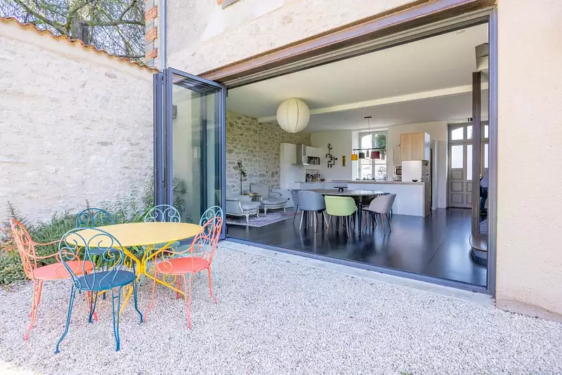 Cet espace convivial s'ouvre sur une terrasse ensoleillée et un jardin clos, intime et verdoyant.