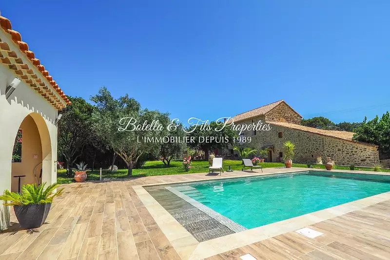 Siuté à 25km à l'Est d'UZES. Lové sur le flanc d'une colline à l'abri d'un site majeur de la Gaule Romaine et entouré à perte de vue de vignobles réputés, on se prend à musarder dans les ruelles tortueuses de ce village, dans un décor médiéval entre des maisons de pierre jusqu'à l'imposante église de style gothique qui depuis son nid d'aigle semble veiller sur un panorama exceptionnel. Cette cité connut richesse et notoriété grâce à la culture de la vigne, ce qui lui permit de s'entourer de fortifications dont la double vocation fut d'assoir sa puissance et de remplir un rôle défensif. C'est au cœur de ce bourg, fort bien achalandé en commerces et prestataires, que fut construit ce mas au XVIIIe siècle sur 1800m² de parc arboré avec bassin de nage (5x10m) et pool house. Le majestueux châtaignier centenaire qui prône sur le jardin pourrait certainement rapporter bien des contes mais il se contente d'une ombre bienfaisante en bavardant avec quelques vieux mûriers, témoins rescapés d'une activité économique révolue, l'élevage du ver à soie. D'une belle superficie d'habitation, 230 m², cette demeure se compose en sus de la maison principale, d'un gîte indépendant et de nombreuses dépendances éventuellement aménageables pour 200m² environ. Il existe une vaste pièce de vie de 68m² agrémentée d'une cuisine entièrement équipée qui profite de la cour et du jardin. Par ailleurs, un bureau et un petit salon, quatre chambres et deux salles de bains. Pour l'aspect pratique, un puits assure un arrosage automatique abondant, un garage permet le stationnement de deux automobiles et un atelier fera le bonheur des bricoleurs. Tout, absolument tout dans cette propriété respire la quiétude et une qualité de vie à laquelle nous sommes très attachés dans le Midi car il en dépend le développement harmonieux de chacun. Les honoraires de l'agence sont à la charge de l'acquéreur. Prix de vente : 745.000€. Honoraires 4.93% Prix Hors Honoraires : 710.000€ Une propriété Botella Immobilier depuis 1989. Réf. 2709
