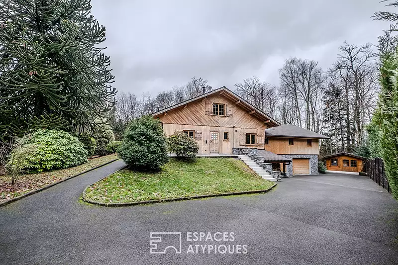 Situé à Bons-en-Chablais, à seulement 40 minutes de Genève et 5 minutes de la gare CEVA, ce chalet de 218 m² habitables s'impose comme une rareté architecturale au coeur d'un parc clos de 5100 m². L'alliance subtile entre le charme vernaculaire et le confort moderne définit cette propriété unique. Dès l'entrée, le ton est donné : l'authenticité d'une pièce de vie esprit "fuste", habillée de vieux bois et réchauffée par un insert, dialogue harmonieusement avec une cuisine dinatoire aux lignes épurées. Cette atmosphère chaleureuse se prolonge dans l'extension contemporaine réalisée en 2020. Véritable cocon de lumière, elle abrite une suite parentale avec dressing et une salle d'eau spectaculaire, sublimée par un puits de lumière et un sol en pierre de Bourgogne. L'étage dessert trois autres chambres confortables, portant le total à six pièces de nuit, idéales pour une vie de famille. La fonctionnalité n'est pas en reste grâce à un sous-sol complet aux prestations soignées : garage double de 60 m² avec portes motorisées, buanderie, atelier, salle de sport et une cave de dégustation type "carnotzet" pour vos soirées conviviales. Une entrée indépendante offre même la possibilité d'une activité libérale. A l'extérieur, le calme règne. Le terrain, boisé d'essences remarquables, dispose de trois terrasses exposées et d'un terrain de pétanque, invitant à la détente sans aucun vis-à-vis. L'âme de cette propriété réside dans l'alliance réussie entre la qualité des matériaux nobles et l'harmonie des styles. Le mariage d'un cachet rustique authentique et de lignes architecturales actuelles confère à ce lieu un esprit de "trappeur chic" absolument incomparable. CLASSE ENERGIE : E / CLASSE CLIMAT : C Montant moyen estimé des dépenses annuelles d'énergie pour un usage standard, établi à partir des prix de l'énergie des années 2021, 2022 et 2023 : entre 4670 Euros et 6400 Euros. Les informations sur les risques auxquels ce bien est exposé sont disponibles sur le site Géorisques : www.georisques.gouv.fr Photos et dossier complet sur demande. CONTACT : Carole 06.50.93.58.70 ESPACES ATYPIQUES GENEVOIS LEMAN Carole LOVISA (EI) Agent Commercial - Numéro RSAC : 827 563 735 - Thonon-les-Bains.