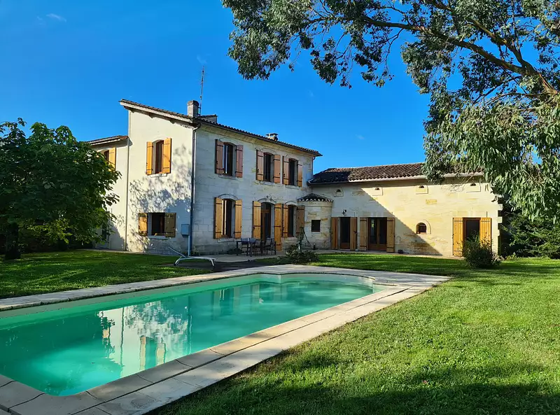 Pour les amateurs de belle demeure ,situation rare, au calme et sans vis à vis, à 3 min des écoles et commerces, 10 min de Libourne et 30 min de Bordeaux ,maison de charme du 18 éme siècle de 270 m2 avec parc de 4500 m2 arboré composée d'une grande piéce à vivre avec cheminée et mezzanine offrant de beaux volumes, grande cuisine contemporaine de 23 m2, salle de billard avec cheminée , 2 suites parentales dont 1 de 36 m2 avec spa et dressing, 3 chambres à l'étage de 16 à 21 m2 , 1 espace bureau, piscine chauffée, grande dépendance, garage 2 places , cave et grenier.