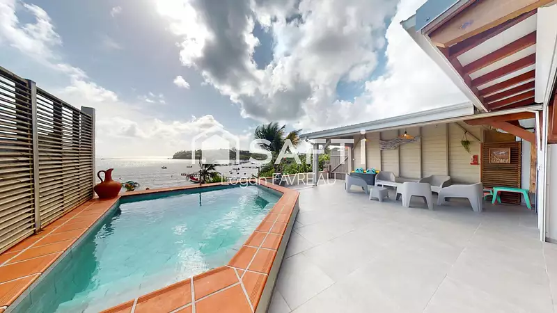 Au rez-de-chaussée, un vaste séjour lumineux ouvert sur une cuisine moderne, une chambre avec salle d’eau, ainsi qu’une belle terrasse couverte prolongée par une piscine face à la mer.