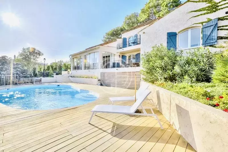 Sur les hauteurs de Cannes, belle villa de 270m2 entièrement rénovée en 2022, bénéficiant d'une vue imprenable sur la mer et le Cap d'Antibes.