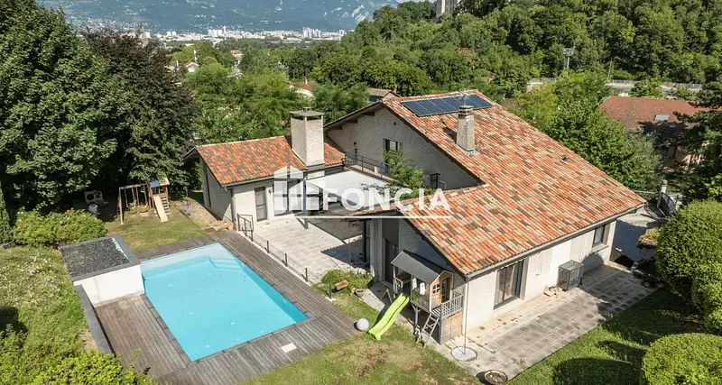 Votre consultant immobilier Emmanuel joignable au O664139669 vous présente à la vente une maison de 1976 de bonnes constructions d'une superficie de 272 m2 habitables et 378 m2 utile, bâtie sur une parcelle de 1745 m2 avec piscine chauffée par une pompe à chaleur, au sein d'un secteur résidentiel à Eybens proche du bourg. Vous y trouverez de beaux volumes habitables comprenant en Rez de jardin une pièce de vie avec cuisine ouverte sur séjour d'une superficie de 62 m2, une arrière cuisine de 6 m2, deux chambres généreuses dont une suite parentale de 28 m2, un bureau, 1 salle d'eau, dressing. L'étage est composé de deux autres chambres de 16 et 21 m2 et salle d'eau. Enfin le Rez de chaussée accessible en voitures est composé d'un double garage de 80 m2 avec portes sectionnelles et dépendances de 80 m2. Les huisseries sont en aluminium fenêtres doubles vitrages, chauffage alimentée par une chaudière au gaz, clim réversible. Secteur très calme et prisé.