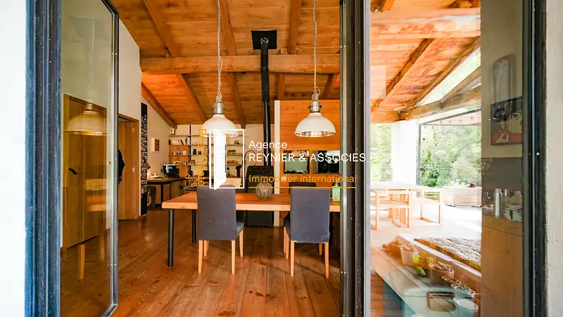 L'habitation occupe le 1er étage avec une pièce de vie spacieuse (75 m2), ouverte sur une terrasse/deck (80 m2) en prise directe sur la forêt. Le double séjour comprend : l'espace dînatoire avec cuisine ouverte à îlot central équipée et cellier, l'espace lounge confortable, un coin bureau et une mezzanine. L'espace nuit dispose de 3 chambres spacieuses : la chambre parentale (18 m2) avec dressing, 2 chambres (12 m2) avec placards. Les sanitaires : salle de bain avec baignoire, grande douche et lavabo à double vasques, WC suspendus séparés. Le local commercial intègre une salle en L (90 m2) ouverte sur la rue par une grande vitrine design. Enfin, le rez-de-chaussée comprend aussi un appartement de 45 m2, avec salle d'eau/WC, ouvert sur le jardin. La villa-duplex et le local commercial offrent 2 univers séparés, avec 2 accès indépendants: côté jardin avec un portail automatique et côté rue avec une grande vitrine.