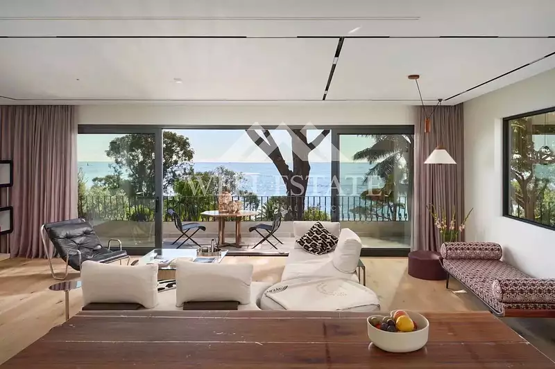 À l’extérieur, un jardin paysager avec des pins et des palmiers entoure la villa, renforçant son caractère exclusif. La grande piscine et la terrasse bénéficient d’une vue à 180 degrés sur le Cap d'Antibes, les Îles de Lérins et Palm Beach Cannes, idéales pour recevoir ou se détendre. Le salon d'été et l'espace repas extérieur sont conçus pour profiter du climat méditerranéen toute l'année, avec la mer en toile de fond.