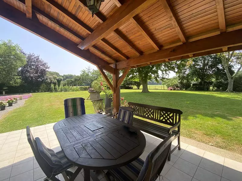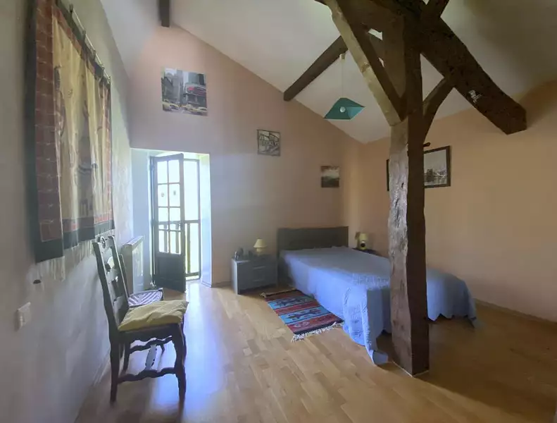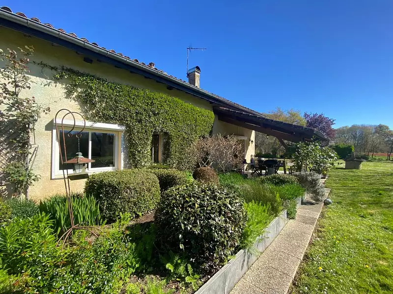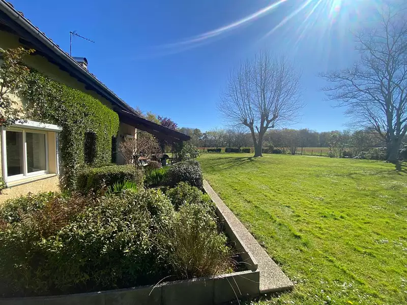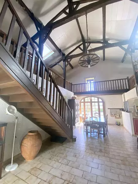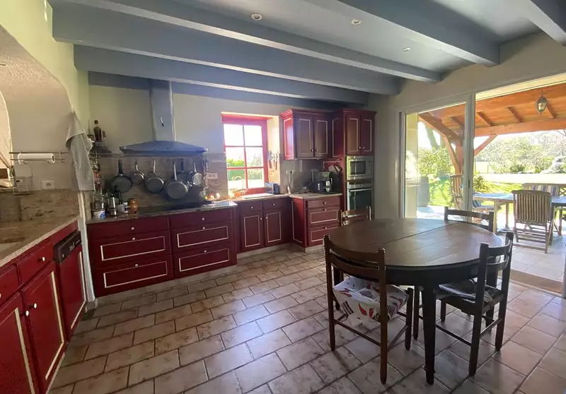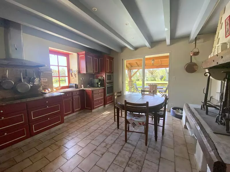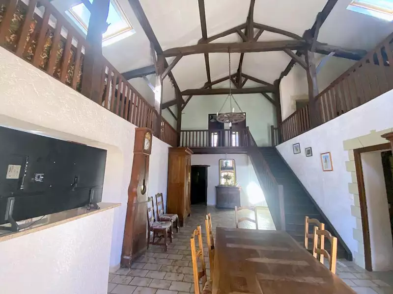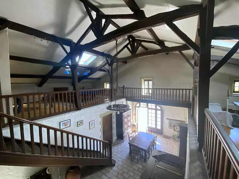 Ouverte sur la nature, sans aucun vis à vis, vous profiterez d'un vaste séjour cathédrale, d'une cuisine avec cheminée ancienne et terrasse couverte, 4 chambres, bureau, salle d'eau, salle de bains, mezzanine, cave et garages attenants.