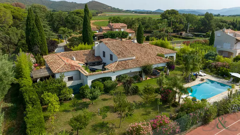 A vendre. La Londe les Maures. Propriété d'environ 280m² pratiquement de plain-pied située dans un environnement champêtre sur 2550m² de terrain plat arboré, paysagé et offrant une piscine 11X5 et un cours de tennis. Sur deux niveaux, elle offre au niveau principal, un double séjour , une salle à manger ouvrant sur un patio avec cuisine d'été, la cuisine principale étant aussi attenante au patio . Une buanderie et une cave complètent cet espace. L'espace nuit offre trois chambres avec salles de bains en suite . A l'étage se trouve une grande mezzanine avec deux chambres et un point d'eau. Garage et atelier. En dépendance un bel appartement deux pièces loué à l'année. Canal de Provence pour alimenter un beau potager et un verger. Sauna sous une terrasse couverte. Rare à la vente. Agence Cellier et Coates 04 94 01 02 01 (3.33 % honoraires TTC à la charge de l'acquéreur.)