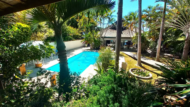 Terrain plat de 12ares sur lequel vous trouverez une piscine béton et une villa balinaise d'environ 80m².