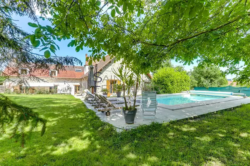 91. Saint-Cyr-sous-Dourdan à 7mns de DOURDAN. Jolie maison ancienne en Pierre de 395m² habitables (280m2 carrez), édifiée sur un terrain de 1785m² avec sa piscine. Elle se compose au rez-de-chaussée: d'un grand salon et salle à manger avec cheminée et poutres apparentes donnant sur une grande terrasse, cuisine dinatoire, buanderie, salon TV et billard, bureau, cabinet de toilette. A l'étage: six chambres, salle de bains, deux WC, salle d'eau, dressing, deux greniers, Mezzanine. Atelier, garage, cave à vins, Piscine chauffée. ensoleillé. Caractère. Pour les amoureux du calme et la verdure cette maison est un havre paix.