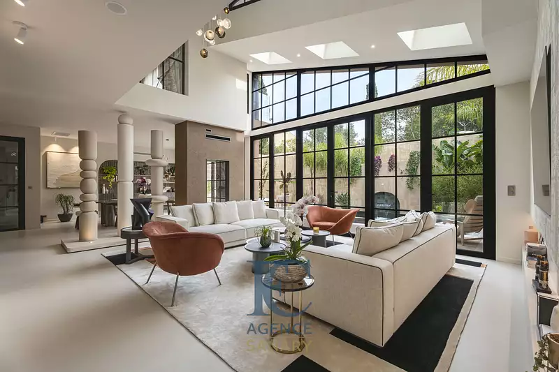 La circulation intérieure est magnifiée par une passerelle aérienne au design contemporain, assurant une connexion fluide entre les espaces et l'extérieur, grâce à de grandes ouvertures vitrées. Les finitions sont une ode à l'élégance : matériaux nobles tels que le noyer de France et la pierre, le marbre, le travertin ainsi que des portes à affleurement.
