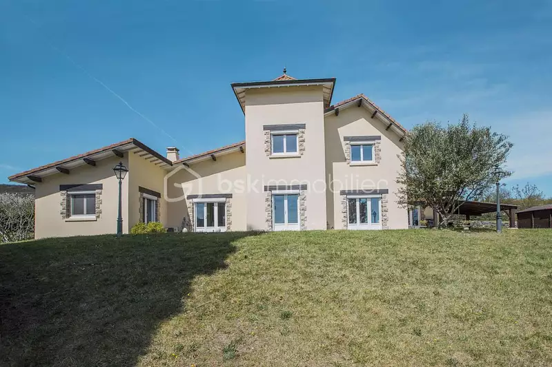 Facile à vivre et fonctionnelle, elle offre 280 m² habitables avec des espaces généreux et plusieurs chambres, complétés par 100 m² de garage et de pièces annexes. Le tout s'étend sur un terrain clos de 3 000 m², exposé plein sud et en position dominante.