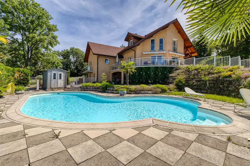 Au bout d'une impasse à Grésy sur Aix, très jolie villa avec belle vue lac et montagne de 7 pièces (6 chambres) d'une surface habitable de 281 m2, située au calme.