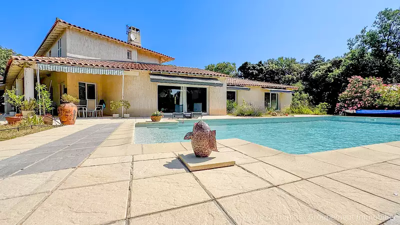 Villa contemporaine d’exception à Uchaux Espace et sérénité Nichée dans un environnement calme et recherché d’Uchaux, cette somptueuse villa de 285 m2 habitables offre un cadre de vie rare, alliant élégance, confort et modernité. Son architecture raffinée met en valeur de beaux volumes baignés de lumière grâce à une exposition plein sud, assurant un ensoleillement optimal tout au long de la journée. Érigée sur un superbe terrain clos et paysagé de 4 789 m2, la propriété garantit intimité et tranquillité. Son extérieur soigné est sublimé par une magnifique piscine (11 x 4,5 m). Dès l’entrée, vous serez séduit par ses vastes espaces de vie : un séjour lumineux de 55 m2 avec cheminée, une salle à manger conviviale et une cuisine séparée avec cellier. Ce niveau abrite également une suite parentale de 40 m2, un bureau, une salle de sport, un studio indépendant, ainsi qu’un espace home cinéma/musique, créant un cadre de vie aussi fonctionnel que remarquable. À l’étage, trois belles chambres, chacune dotée de sa salle de bain privative, offrent confort et intimité. Une salle d’eau supplémentaire et un WC indépendant complètent ce niveau. Plusieurs espaces peuvent être aménagés en chambres supplémentaires, portant la capacité totale à sept chambres selon les besoins. Les prestations haut de gamme de cette propriété assurent un confort optimal en toute saison : Chauffage et climatisation : Pompe à chaleur air/eau haute température avec ventilo-convecteurs et radiateurs acier pour le chauffage en hiver, pompe à chaleur air avec ventilo-convecteurs pour la climatisation en été. Énergie : Panneaux photovoltaïques 6 kWc avec complément secteur, panneaux solaires dédiés à la production d’eau chaude avec ballon électrique de 200 L et électricité. Autres équipements : eau de ville, Forage, adoucisseur d’eau, fibre optique, local piscine, arrosage automatique (plusieurs zones : haie, plantes et pots) Côté annexes, la villa dispose d’un double garage de 50 m2, d’une cave de 16 m2, d’un préau et d’un bûcher, offrant des espaces de vie ou de rangement appréciables. Alliance parfaite entre standing et sérénité, cette villa unique est une opportunité rare pour les amateurs de grands espaces et de prestations raffinées, à seulement quelques minutes des commodités. Réseau : Groupement Immobilier Vos agents : Sylvie 06 70 31 37 55 & Thomas 06 47 94 36 90