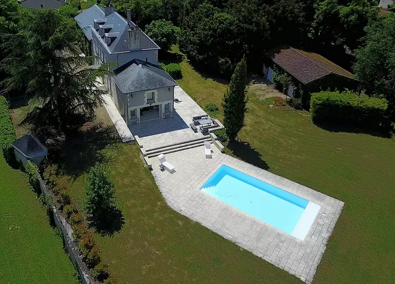 En extérieur : deux grandes terrasses, piscine chauffée au sel 10x5, terrain de pétanque, dépendances (gloriette, préau, bûcher, ancienne écurie, dépendance avec cave). Terrain clos de murs en pierre et paysagé de 4 982 m2, sans vis-à-vis.