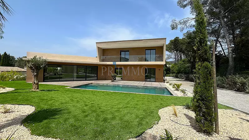 Boulouris, calme absolu en fond d'impasse, villa neuve 7 pièces de 288 m2 composée d'un vaste double séjour de 90 m2 avec cuisine équipée ouvrant sur terrasse plein sud avec piscine, 5 chambres avec salles de bains .Grande salle de sport et double garage. Prestations de qualité. Le tout sur une 1267 m2 de terrain complanté.