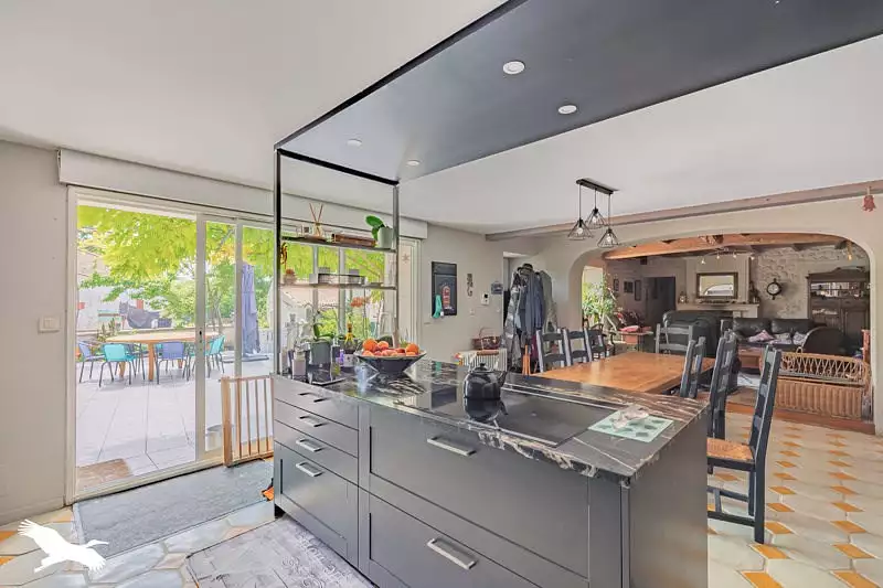 Belle maison en pierre exposée plein sud, au calme, sur un terrain arboré d'environ 2180 m². Elle offre : cuisine équipée ouverte sur séjour,5 chambres dont une suite parentale,2 salle de bains,bureau, arrière-cuisine,salle de jeux, terasse, carport, garage. Parfait pour une grande famille ou un projet de gîte/location saisonnière.