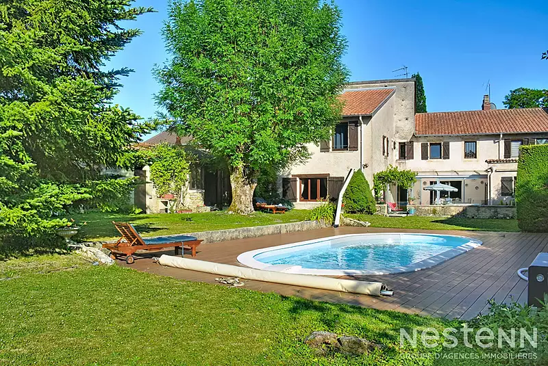 A 6 minutes de Laxou ! Située au coeur d'un village recherché avec toutes commodités (médecins, écoles, commerces, transports), cette belle maison traversante de 290 m² habitables offre de grands volumes et un cadre de vie paisible, à seulement quelques minutes de la ville. Ancienne ferme rénovée avec soin, elle se compose en rez-de-chaussée d'un salon lumineux, d'une véranda chauffée ouverte sur un grand jardin clos arboré, d'une salle à manger, d'une cuisine équipée, d'une vaste pièce de réception avec bar, buanderie et WC indépendant. Possibilité de créer de ce rez-de-chaussée, un espace de vie de plain-pied. A l'étage : 5 chambres, 3 salles d'eau/bain, un bureau lumineux avec terrasse surplombant le jardin et la piscine, ainsi qu'un grenier aménagé sous combles (salle de jeux, bureau ou chambre d'appoint). A l'extérieur, un jardin clos avec piscine chauffée, coin bois et accès à la Moselle créent une ambiance de vacances toute l'année. Garage, cave, atelier, dépendance, chauffage gaz avec un appoint par un insert bois, double vitrage, toiture en bon état. Une propriété rare alliant charme de l'ancien, confort moderne et nature à deux pas de la ville. Maude STREIFF (EI) Agent Commercial - Numéro RSAC : 937 893 048 - NANCY.