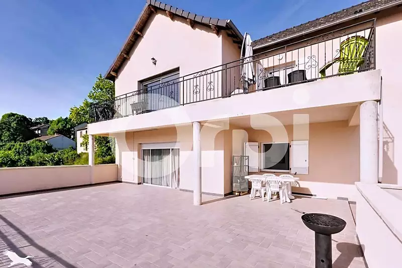 Le niveau inférieur propose un spacieux salon-séjour avec cuisine ouverte, s'ouvrant sur une grande terrasse offrant une vue imprenable sur la vallée. Il dispose également de 3 chambres confortables, parfaites pour recevoir des invités ou pour un usage locatif, d'une salle d'eau moderne avec douche et baignoire, ainsi qu'un garage offrant un espace de rangement pratique.