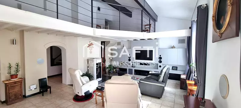 Vous découvrirez un vaste espace de vie au style loft, avec home cinéma intégré (11 enceintes surround) et mezzanine, ainsi qu’une cuisine équipée réalisée avec de beaux matériaux (plan de travail en granit).