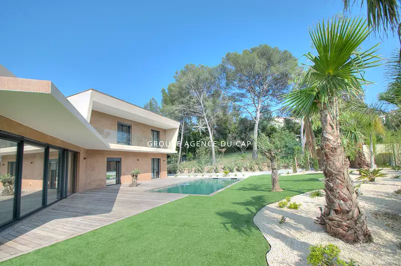 Très belle villa contemporaine de plus de 290m², au calme, profitant d'une parcelle de terrain plat de 1267m² aménagée avec piscine et terrasse. Cette villa terminée en 2025, offre de beaux volumes intérieurs, avec un vaste séjour de 90m² environ avec cuisine ménagée et cellier attenant, le tout sortant sur une belle terrasse plein sud de plus de 70m² donnant accès à la piscine et au jardin, 5 chambres en suite dont une de plain pied, une salle de sport avec sanitaire et sauna et un double garage. Prestations haut de gamme et actuelles, avec les dernières normes d'isolation thermiques et phoniques. Pour plus de renseignement n'hésitez pas contactez l'agence du cap au 04.94.82.48.38.