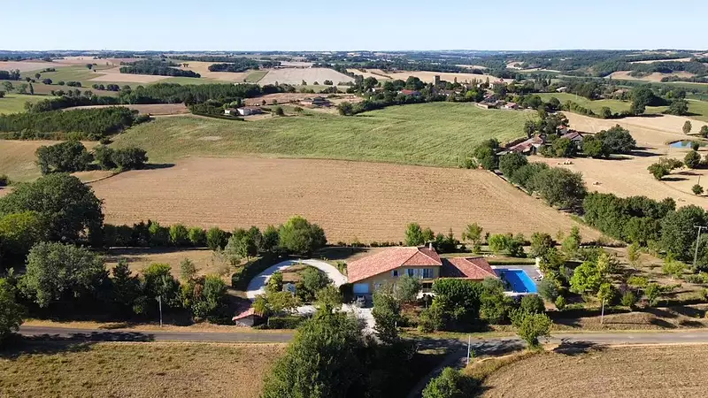 GERS - Dans la campagne de Vic-Fezensac, grande maison d'architecte construite en 2007 de 291 m² habitables sur une parcelle paysagée de 9128 m² avec piscine bénéficiant de jolies vues sur le village et les Pyrénées.