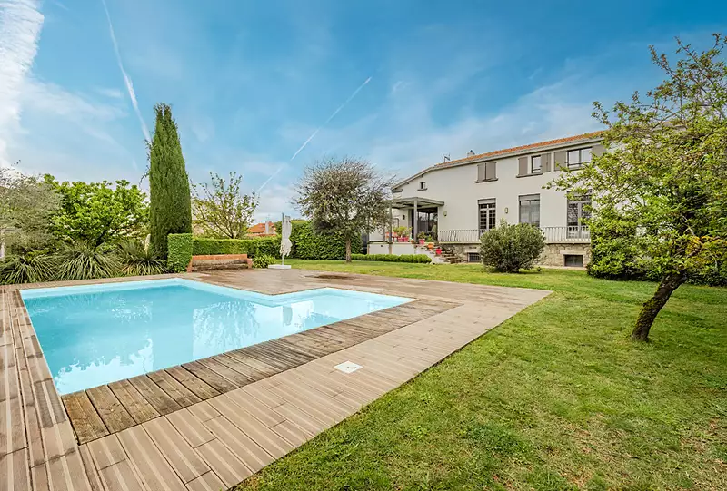 Nous sommes ravis de vous présenter cette superbe maison d'architecte des années 50, entièrement rénovée avec soin et située dans un quartier très convoité à seulement 5 minutes du centre-ville d'Albi. Dotée d'une surface habitable d'environ 295 m², cette propriété offre un cadre de vie exceptionnel pour les familles à la recherche d'un bien spacieux et confortable. La maison s'élève sur un vaste terrain d'une superficie de 1810 m² agrémenté d'une piscine où vous pourrez profiter des chaudes journées estivales en toute intimité. En franchissant l'entrée, vous serez immédiatement séduit par l'atmosphère chaleureuse qui règne dans cette demeure. Les espaces de vie ont été judicieusement répartis pour offrir une fluidité parfaite entre les différentes pièces. Le salon, d'une surface généreuse de 50 m², est baigné de lumière naturelle et dispose d'une grande cheminée ainsi que d'un accès à une large terrasse en partie couverte et au jardin. La cuisine de 25,61 m² est entièrement équipée et offre un espace convivial. Un cellier est également à votre disposition. La maison comprend également une salle à manger spacieuse, parfaite pour recevoir vos convives. Un bureau de 19,19 m² offre un espace de travail confortable et propice à la concentration. L'espace nuit se compose de plusieurs chambres bien aménagées. La chambre principale, d'une superficie de 25 m², offre une retraite paisible avec sa propre salle de bains et un dressing. Trois autres chambres de taille généreuse offrent également des salles de bains privatives, vous assurant ainsi un confort absolu. La maison dispose également d'une salle de jeux. Des toilettes supplémentaires sont judicieusement réparties dans l'ensemble de la propriété. En plus de son intérieur élégant, cette maison bénéficie d'un emplacement de choix, dans un quartier plébiscité. Vous serez à proximité de toutes les commodités, des écoles, des commerces et des transports en commun. Enfin, nous pouvons noter la présence d'un vaste sous-sol comprenant un grand garage, une cave à vin, d'une chaufferie et de nombreux espaces de rangement. Le chauffage est assuré par le gaz de ville et la maison est équipée de la climatisation. Contactez-nous dès maintenant pour organiser une visite et laissez-vous charmer par cette très belle maison. (4.14 % honoraires TTC à la charge de l'acquéreur.)