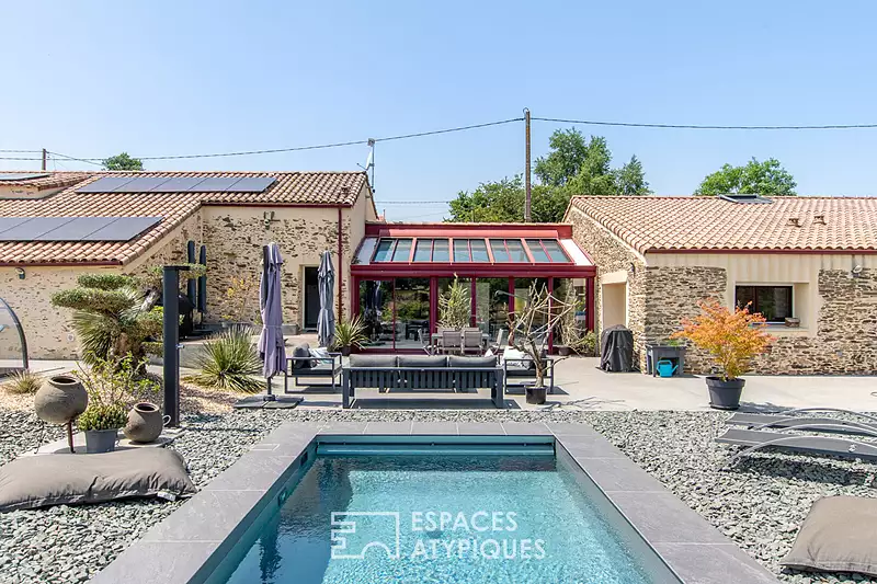 Niché au coeur de la nature à Saint-Florent-des-Bois sur la commune de Rives-de-l'Yon, découvrez cette belle demeure composée d'une ancienne grange et d'un corps de ferme réunis par une élégante verrière, offrant 295 m² habitables sur un vaste terrain de 13 000 m². Cette propriété offre un cadre de vie exceptionnel où le charme rustique rencontre le confort moderne. La rénovation intérieure a su préserver l'authenticité des bâtiments tout en intégrant des éléments contemporains, créant une ambiance chaleureuse et accueillante. Les poutres apparentes et les volumes généreux de la grande pièce de vie en témoignent, offrant un espace idéal pour se détendre et recevoir. La maison, de plain-pied, se compose d'une vaste pièce de vie avec toit et poutres apparentes, d'une zone nuit comprenant trois chambres et une grande suite parentale donnant sur le jardin, ainsi que d'un bureau en mezzanine. Un studio indépendant complète cet ensemble, offrant un espace supplémentaire pour les invités ou un atelier. Côté pratique, la propriété dispose d'un carport, d'un garage et d'une grande buanderie. Le jardin paysager, inspiré des ambiances zen et japonisantes, est un véritable havre de paix. Vous y trouverez une belle terrasse, plusieurs bassins, et de beaux végétaux. La piscine, avec sa margelle en pierre sombre très contemporaine, et la terrasse avec jacuzzi abrité, sont parfaits pour se détendre et profiter des beaux jours. Le terrain comprend également une grande serre, des arbres fruitiers et un beau potager. La propriété est conçue pour accueillir des chevaux, avec des parcelles en prairie et une grange totalement équipée comprenant un atelier, une sellerie et des écuries avec des box pour quatre chevaux. Les panneaux solaires pour la production d'électricité et le chauffage par géothermie assurent confort et économies d'énergie. Située au milieu de la nature, cette propriété offre un cadre de vie paisible tout en étant proche des commodités. Les premiers commerces se trouvent à seulement 5 minutes en voiture, et la ville de La Roche-sur-Yon est accessible en 20 minutes. Les plages sont à 40 minutes, parfaites pour des escapades en bord de mer. Cette propriété rare, qui séduira les amoureux des vieilles pierres, de la nature et les personnes cherchant à un hébergement pour leurs chevaux, est à découvrir sans tarder. CLASSE ÉNERGIE : C - CLASSE CLIMAT : A. Montant moyen estimé des dépenses annuelles d'énergie pour un usage standard établi à partir des prix de l'énergie de l'année 2021 : entre 2670 euros et 3700 euros. Les informations sur les risques auxquels ce bien est exposé sont disponibles sur le site Géorisques pour les zones concernées: www.georisques.gouv.fr Contact (EI) : Philippe THEVENIN au 07 88 48 71 76 Agent commercial immatriculé au RSAC de LA ROCHE-SUR-YON sous le numéro 2023AC00193 Les honoraires sont à la charge vendeur.