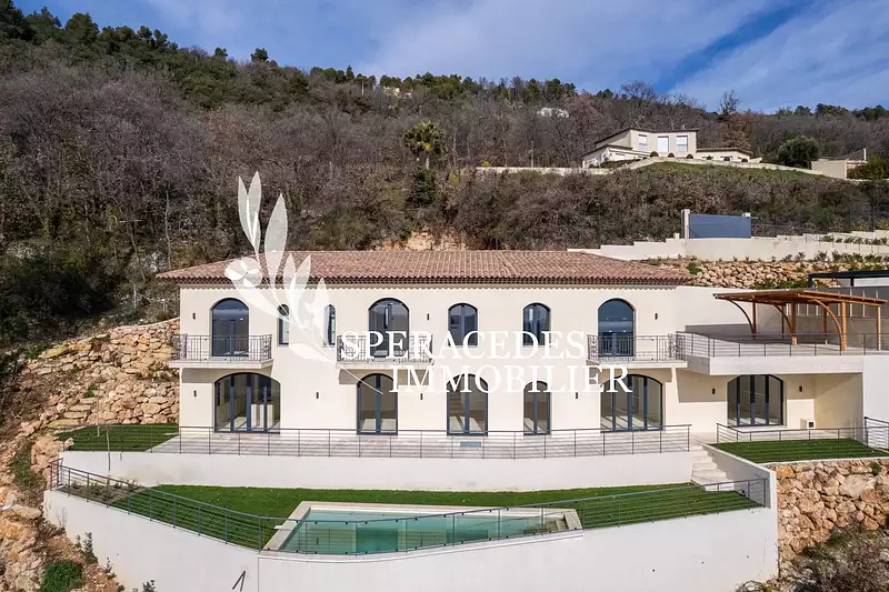 En position dominante sur les collines de Spéracèdes, au bout d'une impasse dans un quartier recherché, cette magnifique villa neuve de 295 m² bénéficie d’une vue imprenable sur la mer, le lac de Saint-Cassien et le village de Cabris, tout en offrant un calme absolu.