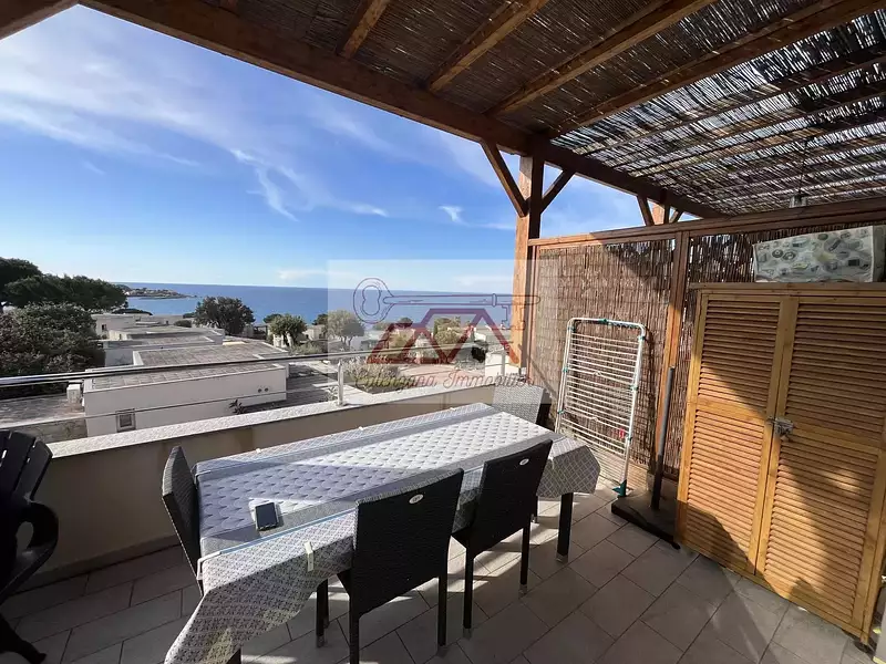 À l’extérieur, une magnifique terrasse de 14,90 m² constitue un véritable atout. Cet espace extérieur permet de profiter pleinement de la vue panoramique sur la mer et d’apprécier des moments de détente en toute tranquillité.