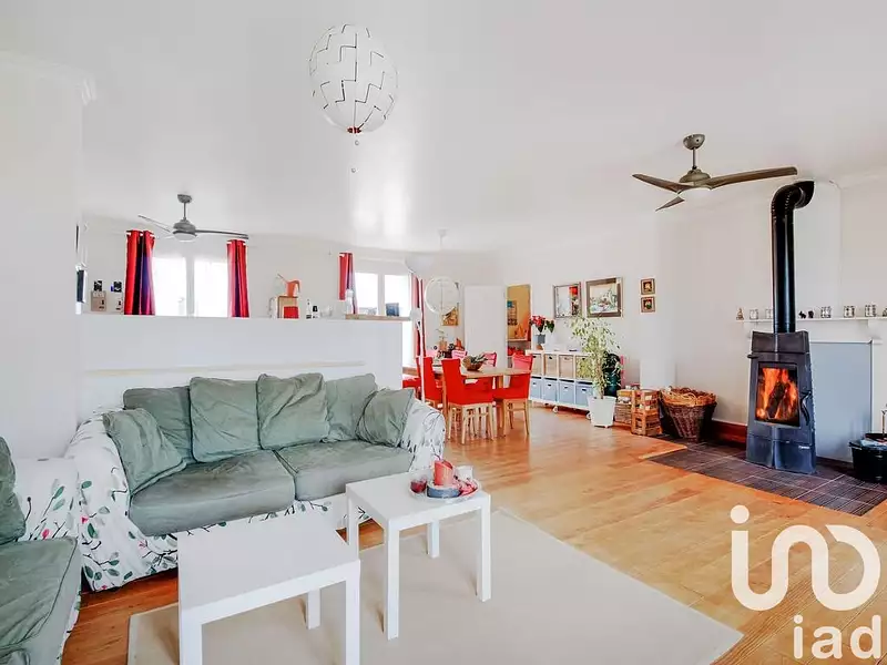 Une entrée accueillante menant à une vaste pièce de vie chaleureuse, agrémentée d'un poêle à bois.