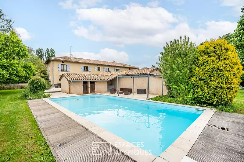 Située à Chaleins, dans un hameau paisible, à seulement 10 minutes de Villefranche-sur-Saône, cette ancienne ferme rénovée développe une surface habitable généreuse, au coeur d'un terrain arboré de 2 600 m², sans vis-à-vis. Les volumes intérieurs conservent tout le charme de l'ancien, sublimés par des matériaux nobles et une belle hauteur sous plafond. La cuisine, ouverte sur la terrasse principale, mêle esprit campagne et fonctionnalité et s'articule harmonieusement avec les autres pièces à vivre. Le séjour, spacieux, baigné de lumière grâce à son orientation plein sud, ouvre sur une seconde terrasse, plus intimiste. Les poutres apparentes, les sols en pierre naturelle et les menuiseries bois apportent une atmosphère chaleureuse et authentique. Une cave spacieuse ravira les amateurs de vin. A l'étage, les cinq chambres offrent de belles perspectives d'aménagement, que ce soit pour une vie de famille ou un projet de maison d'hôtes. Deux salles d'eau et une salle de bains complètent cet espace nuit. A l'extérieur, le vaste jardin paysagé, sans aucun vis-à-vis, profite d'une vue dégagée sur les collines du Beaujolais. Une piscine agrémente les beaux jours, tandis que plusieurs terrasses en pierre reconstituée invitent à la détente à chaque heure de la journée. De nombreuses dépendances, atelier, garage et espaces de rangement complètent ce bien. Un lieu singulier, où chaque espace raconte une histoire, entre caractère rural et prestations soignées. Ce corps de ferme rénové séduit par sa rareté, son authenticité et son environnement préservé. CLASSE ENERGIE : E / CLASSE CLIMAT : E Montant moyen estimé des dépenses annuelles d'énergie pour un usage standard, indexées aux années 2021, 2022, 2023 : entre 8 090 et 10 980 euros (abonnement compris) Contact : Héloïse - 06 68 44 82 46 Héloïse Restier (EI) Agent Commercial - Numéro RSAC : - .