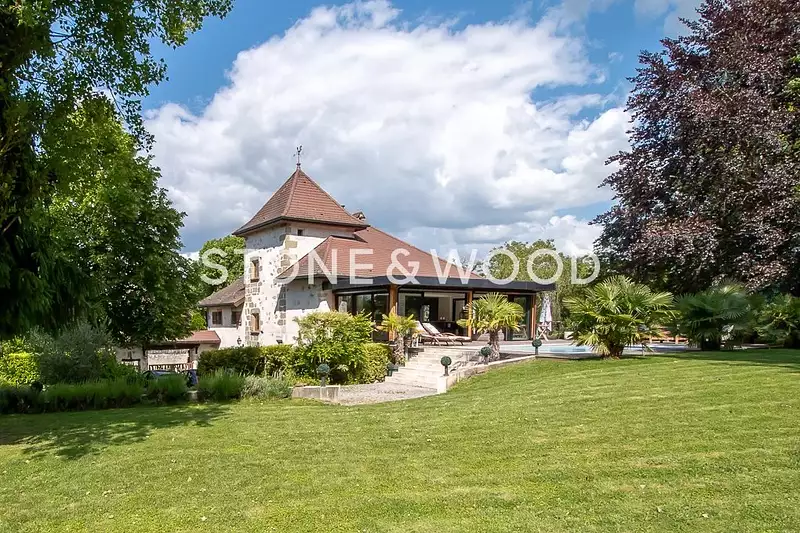 Dans un cadre champêtre, très paisible, à seulement quelques minutes d'Annecy et 45 min du centre de Genève, cette splendide demeure de caractère, édifiée en 1301, s'étend sur un parc arboré de plus de 4000 m2, dans un calme absolu.