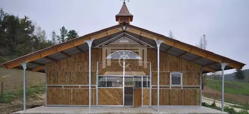 1 barn de 200 m2, 5 boxes 3.50 x 3.50, 1 box poulinière de 3.50 x 5, sellerie, aire de pansage, 1 grange 200m2, 1 hangar de stockage de 50m2, une douche chevaux, 1 bureau etc.....
