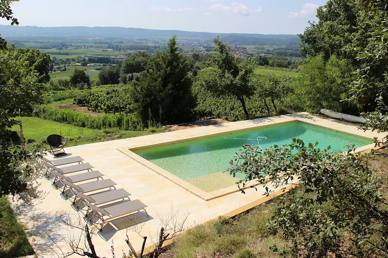 Le terrain de 1.4 hectare est composé d'une partie boisée et d'un jardin naturel autour de la maison. L'espace piscine est le clou du spectacle : un peu éloigné du mas, la piscine (environ 13 mx 6) a été implantée pour bénéficier d'une vue exceptionnelle sur la campagne.
