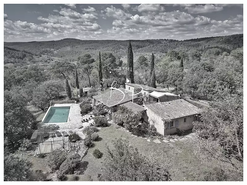 Un havre de charme perché au sommet d'une colline, avec vue panoramique exceptionnelle A l'abri des regards, dans un environnement rare et enchanteur, cette propriété de caractère vous accueille dans un cadre hors du temps. Située en hauteur, elle offre une vue spectaculaire à 360° sur la nature environnante, véritable tableau vivant qui évolue au fil des saisons. Dès l'entrée, le charme opère : plafonds aux poutres anciennes, sols habillés de tomettes d'époque et carreaux en terre cuite émaillée signés Alain Vagh confèrent à l'ensemble une atmosphère chaleureuse et authentique. Chaque détail a été pensé avec goût et raffinement. L'espace de vie principal, généreux et lumineux, s'articule autour d'une majestueuse cheminée en pierre et de multiples ouvertures sur l'extérieur. La cuisine, conviviale et bien équipée, invite à partager de beaux moments en famille ou entre amis. Un bureau, pouvant servir de quatrième chambre, complète cet espace pour les besoins du quotidien. L'aile nuit propose trois chambres avec accès extérieur, chacune avec sa salle d'eau ou salle de bain privative, offrant intimité et confort à ses occupants. Un logement indépendant, accessible par un patio à ciel ouvert, abrite un salon intime, une chambre, une salle de douche et une véranda baignée de lumière, idéale pour accueillir famille, amis ou même pour envisager une activité d'accueil. A l'écart, une ancienne maison de gardien a été aménagée avec charme en un agréable appartement de trois pièces ainsi qu'un studio confortable, chacun avec entrée indépendante. La vaste piscine (12x6 m), surplombant les restanques, invite à la détente. Une grande plage carrelée, un pool house entièrement équipé avec cuisine d'été et barbecue prolongent les espaces de vie vers l'extérieur. La propriété propose aussi des équipements de confort : terrain de tennis, boulodrome, arrosage automatique, fibre, double vitrage, garage, grand parking, 2 forages? Le tout en conservant l'authenticité d'une bastide provençale de caractère. A quelques minutes seulement des villages animés et pittoresques de la région, cette maison singulière offre une expérience de vie unique, entre nature, art de vivre et beauté architecturale. Lien vers la vidéo : Virginie FAURIAUX (EI) Agent Commercial - Numéro RSAC : 878424357 - DRAGUIGNAN.
