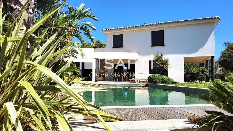 Elle propose 3 suites parentales avec une salle d'eau pour chacune, dont une avec rooftop et vue mer, 3 chambres, trois water closets, une salle de bains, dressings, salle de sport, salle de cinéma, salle de jeux, un immense garage. Climatisation, volets roulants centralisés, arrosage automatique, terrain de pétanque, matériaux haut de gamme.