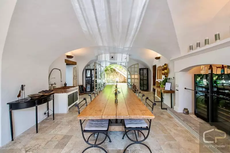 Description de la Propriété Référence : LES BEAUMETTES Adresse : Les beaumettes 84220 Gordes Caractéristiques Principales Pièces : 10 Nombre de salles de bain : 9 Nombre de chambres : 9 Surface habitable : 307 m² Surface du terrain : 1924 m² Style : Rustique État : Rénové Ameublement : Meublé Description Complète Située à 8 km de Gordes, cette bâtisse transformée en chambres d'hôtes de 360 m² de surface habitable incarne le parfait équilibre entre l'authenticité provençale et la modernité. Localisée dans la plaine au pied des Monts du Vaucluse, cette propriété entièrement rénovée offre une atmosphère charmante et authentique. L'intérieur spacieux comprend : Un salon accueillant Une salle à manger Une cuisine équipée semi-professionnelle Une buanderie Neuf chambres spacieuses, chacune dotée d'une salle de douche et/ou de bains Pour profiter de la tranquillité des lieux, un joli patio ombragé, une piscine chauffée, ainsi qu'un espace détente avec sauna et jacuzzi, offrent tout le confort nécessaire pour passer des moments privilégiés en famille ou entre amis. Détails de la Propriété Salon : Oui Salle à manger : Oui Cuisine : Indépendante et équipée Suites : Neuf suites avec salle d'eau Spa : Oui Buanderie : Oui Garage : Oui L'extérieur en restanques est agrémenté d'une piscine chauffée, créant un cadre idyllique pour la détente et les loisirs. Cette propriété exceptionnelle est idéale pour un usage familial ou une activité hôtelière.