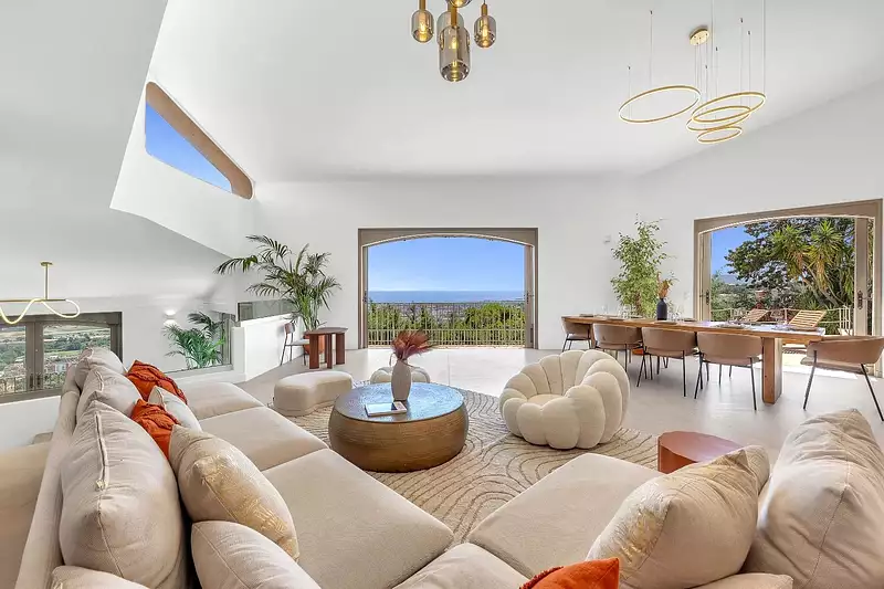 Sur les hauteurs de Mandelieu, cette villa de 300 m² entièrement rénovée dans un style provençal contemporain offre une vue mer à couper le souffle.