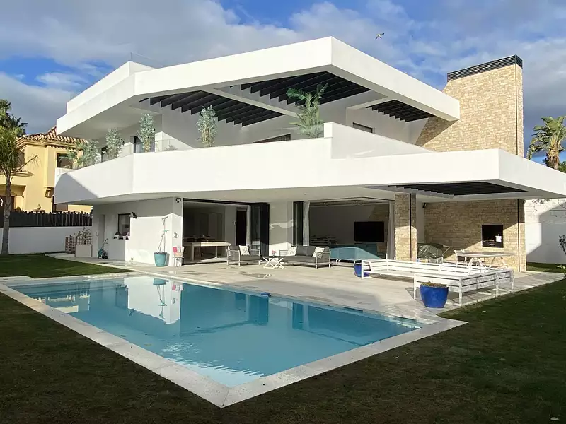 Villa de luxe, située à quelques pas de Puerto Banus. La propriété a un design unique. Il a toutes les caractéristiques attendues dans une maison de luxe moderne à Marbella. Elle se compose d'un espace de vivre agréable avec une distribution parfaite. La maison dispose d'un salon donnant sur une terrasse et la piscine, séparées par de grandes baies vitrées. Les fenêtres glissent complètement et font rejoindre la salle à la terrasse. L'effort d'intégrer toutes les zones en un, y compris la piscine, rend cette maison beaucoup mieux que la plupart. La cuisine américaine rejoint une grande salle à manger. Au premier étage une chambre pparental qui dispose d'un beau dressing qui se connecte à la salle de bains haut de gamme en suite, ainsi qu'autres deux autres chambres et un solarium. Le sous-sol dispose de 2 chambres supplémentaires et d'un salon, le tout avec lumière naturelle. Il y a des salles de bains privatives dans toutes les chambres. La propriété dispose de soleil et d'ombre, plusieurs salons et salles à manger sont à l'extérieur, ainsi qu'une grande piscine avec douche et toilettes accessibles depuis la piscine. La villa se trouve à 10 minutes à pied de la plage et de la marina de Puerto Banus, connue comme la zone la plus luxueuse de toute l'Espagne.