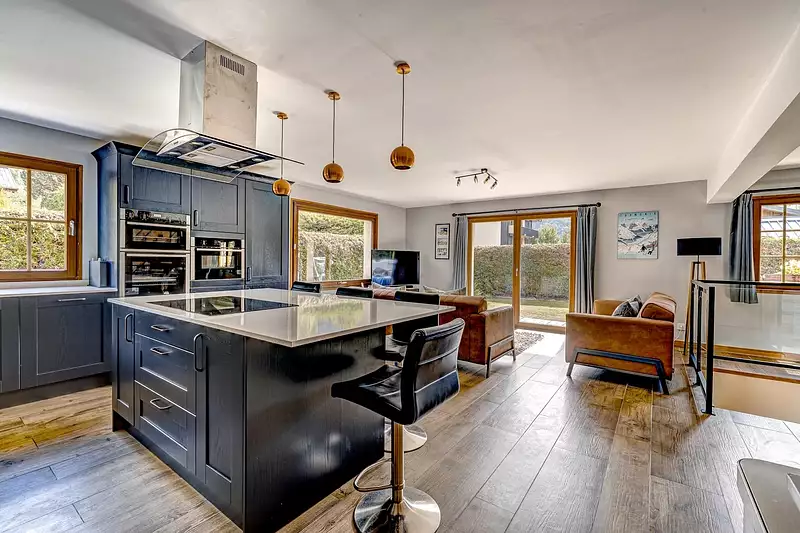 Le salon s'ouvre sur un petit jardin plat et une terrasse de bonne taille offrant une vue imprenable sur le glacier des Bossons, l'Aiguille du Midi, le Dôme du Goûter et le Mont Blanc lui-même.