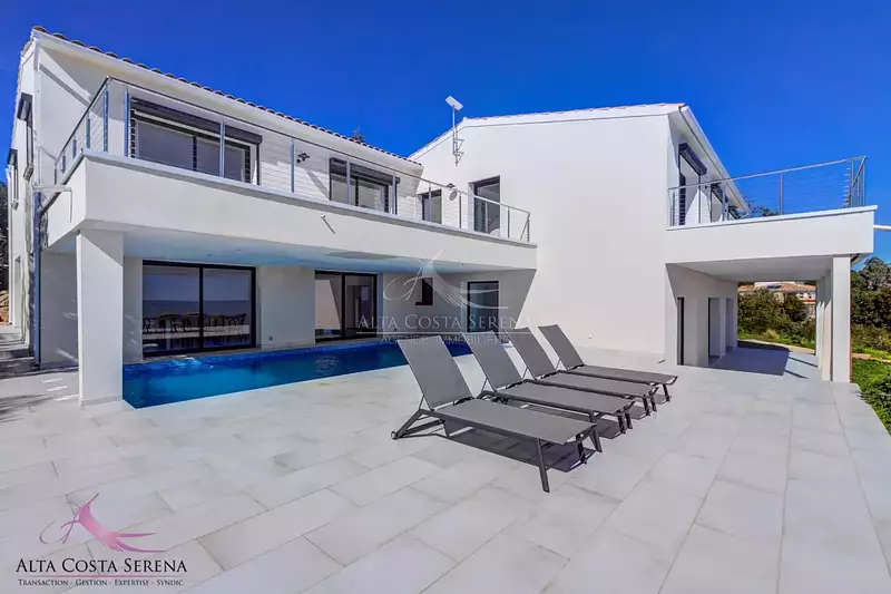 De l’autre côté, un salon raffiné ouvert sur la piscine s’accompagne d’une cuisine fonctionnelle. Un espace buanderie et une salle de douche supplémentaire complètent ce niveau et mènent à un étage regroupant trois chambres, chacune dotée de sa propre salle de bain, garantissant ainsi confort et intimité. Deux d’entre elles partagent une terrasse avec une vue exceptionnelle.