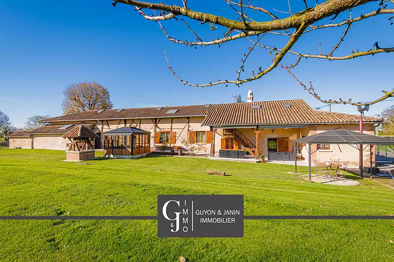 EXCLUSIVITE - Longère Bressane entièrement rénovée Visites uniquement sur justificatif de financement. L'AGENCE GUYON JANIN IMMOBILIER vous présente dans le paisible village de Chaveyriat cette authentique ferme bressane entièrement rénovée alliant charme d'antan et confort moderne. Idéalement située à proximité de nombreux domaines, des axes autoroutiers et à quelques minutes de Vonnas, ville renommée pour le restaurant étoilé de Georges Blanc, cette maison bénéficie d'un emplacement stratégique qui en fait un investissement particulièrement judicieux. Cette propriété d'exception de 317m² habitables vous séduira par ses prestations haut de gamme et son potentiel locatif exceptionnel. - Surface totale : 360 m² - Surface habitable : 317 m² - Surface terrain : 2314 m² Actuellement aménagée en maison d'hôtes, ce bien est séparé en deux parties totalement indépendantes. Cette demeure propose deux salons/salle à manger, deux cuisines et sept suites parentales soigneusement décorées, chacune avec sa propre salle de bain privative. Les suites vont de deux à six couchages. La rénovation qualitative préserve tout le cachet des fermes bressanes avec ses poutres apparentes et ses volumes généreux. Pour agrémenter votre quotidien, profitez d'un espace bien-être avec jacuzzi, idéal pour se détendre après une journée bien remplie. L'extérieur n'est pas en reste avec un magnifique terrain de 2300m², un carport et un garage pour stationner vos véhicules en toute sécurité. Cette propriété est vendue entièrement meublée, vous permettant de démarrer immédiatement votre activité ou d'emménager sans contrainte. Du côté technique : - Double vitrage PVC - Assainissement aux normes - Chauffage bois et électrique (PAC Air/Air - climatisation réversibles dans chaque chambre) - Portail électrique - Cour en pavé Que vous soyez un investisseur à la recherche d'une maison d'hôtes clé en main au fort potentiel locatif, ou une famille souhaitant accueillir parents et amis dans un cadre exceptionnel, cette propriété répondra à toutes vos attentes. Ne manquez pas cette opportunité unique d'acquérir un bien d'exception alliant patrimoine, confort et rentabilité dans un environnement privilégié de l'Ain.