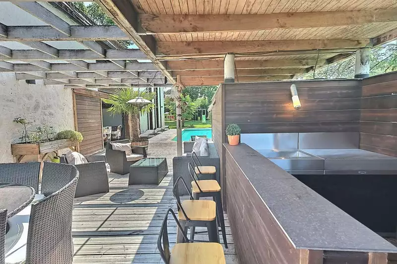 Vue dégagée sur piscine, terrasse et cuisine d'été pour moments conviviaux
