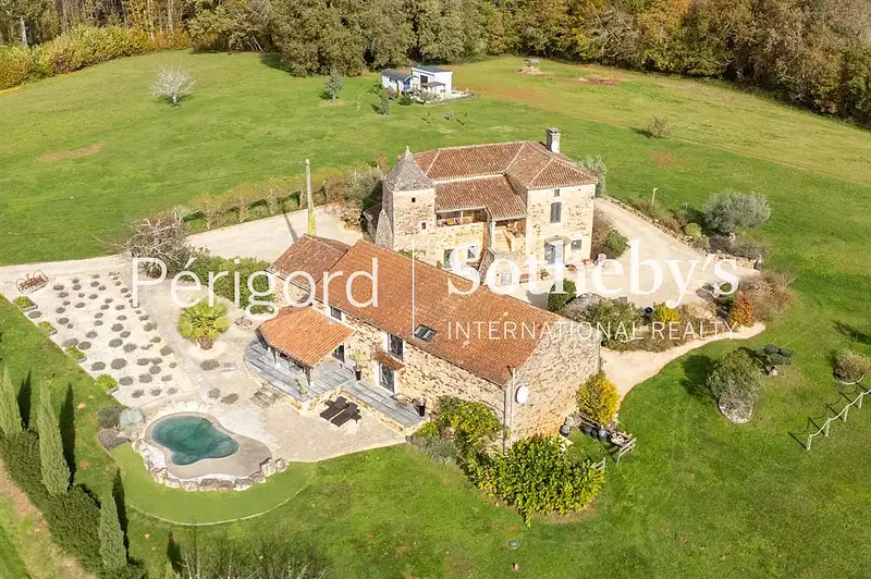 A la confluence de 3 départements, la Dordogne, le Lot et le Lot et Garonne, cette demeure magnifiquement restaurée du XIIIeme siècle , remarquable par sa tour fortifiée, a traversé les siècles en épousant l'histoire: relais de poste à la Renaissance, elle devint refuge des maquisards durant la Seconde Guerre mondiale. D'une superficie d'environ 250m2 et sur deux étages, elle se compose en rez de chaussée d'une charmante cuisine entièrement équipée, ouverte sur le salon, et d'une vaste chambre en suite. Puis au premier étage, accessible également par l'escalier extérieur et menant à la superbe terrasse sous charpente, un double salon et sa cheminée monumentale, ainsi qu'une chambre et sa salle de douche. La vue , les levers et couchers de soleil de la terrasse sont à couper le souffle. Au dernier étage, un véritable cocon doté d'une chambre avec salle de bain à l'atmosphère loft, puis une dernière chambre pouvant servir aussi de bureau. La dépendance, face au puit-cabane, a été aménagée en garage de trois emplacements généreux, et atelier. La hauteur de la charpente permet aussi d'imaginer une mezzanine selon les besoins. Attenante à celle-ci, une vaste buanderie. Le cottage de 70m2 et sa splendide terrasse , meublé avec raffinement , dispose d'une chaleureuse cuisine, un salon , puis à l'étage deux chambres en suite dont une avec balcon surplombant l'étonnante piscine lagon avec jacuzzi. Pour ajouter un coté bucolique au domaine , une charmante roulotte dispose d'une chambre, d'une cuisine, d'une salle de douche et de toilettes écologiques.